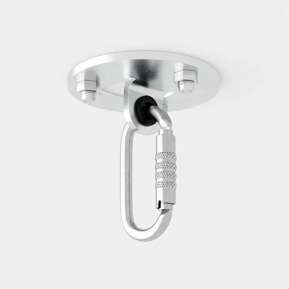 The plate has a diameter of 12 cm and the distance between the holes is less than 10 cm, allowing it to be fixed both to the reinforced concrete joists commonly found in domestic ceilings and to a wooden beams. Always consult an experienced professional to determine if the ceiling or beam to which you intend to attach your anchor point is suitable for the purpose.