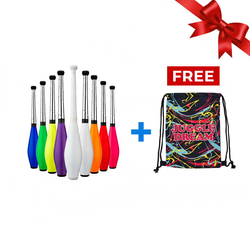Choose your colour preference and get a free Juggle Dream Splash Drawstring Bag with your set. Perfect for circus training, performance, and juggling enthusiasts worldwide.