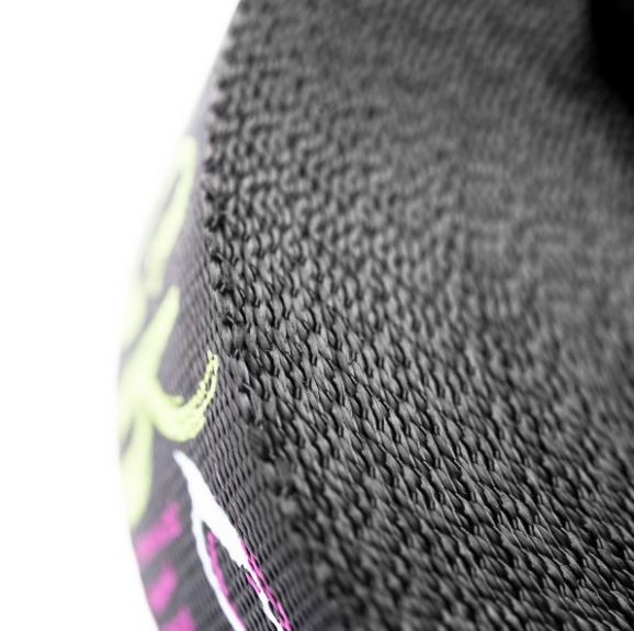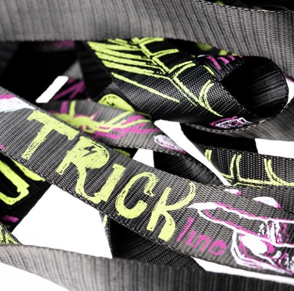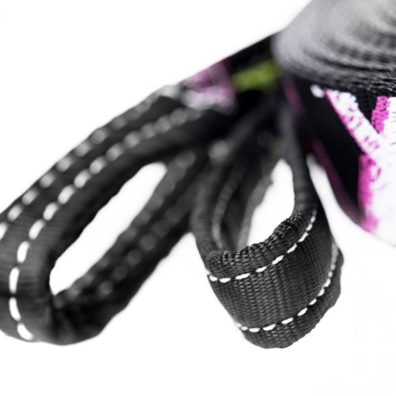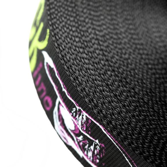 This line is the top performer of the 5cm wide webbings. Ideal length for the most demanding slackliner, perfect dynamism, no compromise of quality. Black night background with light printing writing to emphasize your performance. You will improve trick after trick. The eye loops are reinforced, the ratchet has a long lever and the special pro-grip print creates a feeling of refined grip and control.