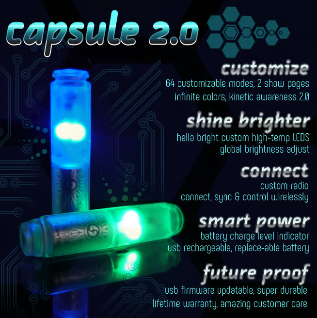 - Capsule 2.0 Light: Featuring 64 customizable modes, a full-color spectrum with over 60 billion colors, and hella bright custom high-temp LEDs. The global brightness control and accelerometer response allow for intuitive, adaptable lighting, while wireless syncing and control take your flow to new heights.
