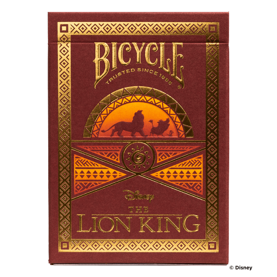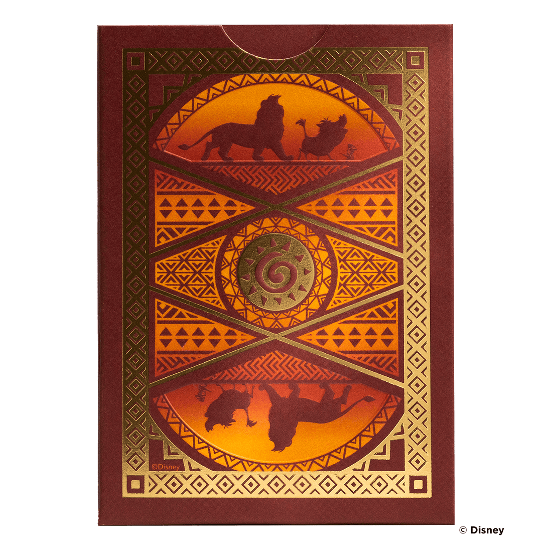 Become the king of game night with Disney Lion King Inspired Playing Cards by Bicycle! Shimmering cold-foil ignites the tuck, card faces and card backs to shine like the savannah sunset, while the legendary lions of Pride Rock grace the court cards with their real elegance. You'll have no worries with the Hakuna Matata ace of Spades in your hand!