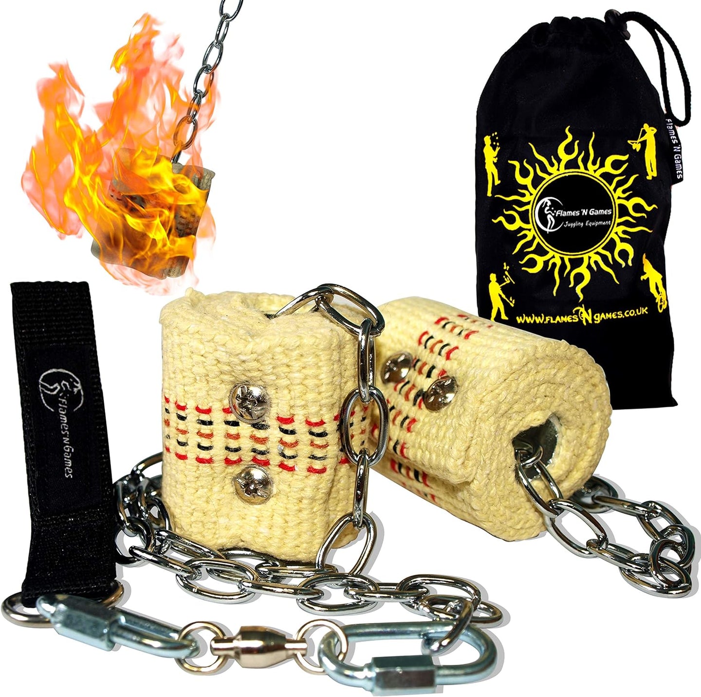 The FIRESTARTER Fire poi are an excellent budget option for those looking to get started with fire. These fire poi have a respectable flame but are not too daunting, making them perfect for beginner to intermediate users of fire poi!;Each poi head is mounted on 43cm of strong welded link chain with riveted double loop nylon webbing handles. Each head uses 470mm of 50mm wide 100% kevlar wick and will burn for around three minutes.