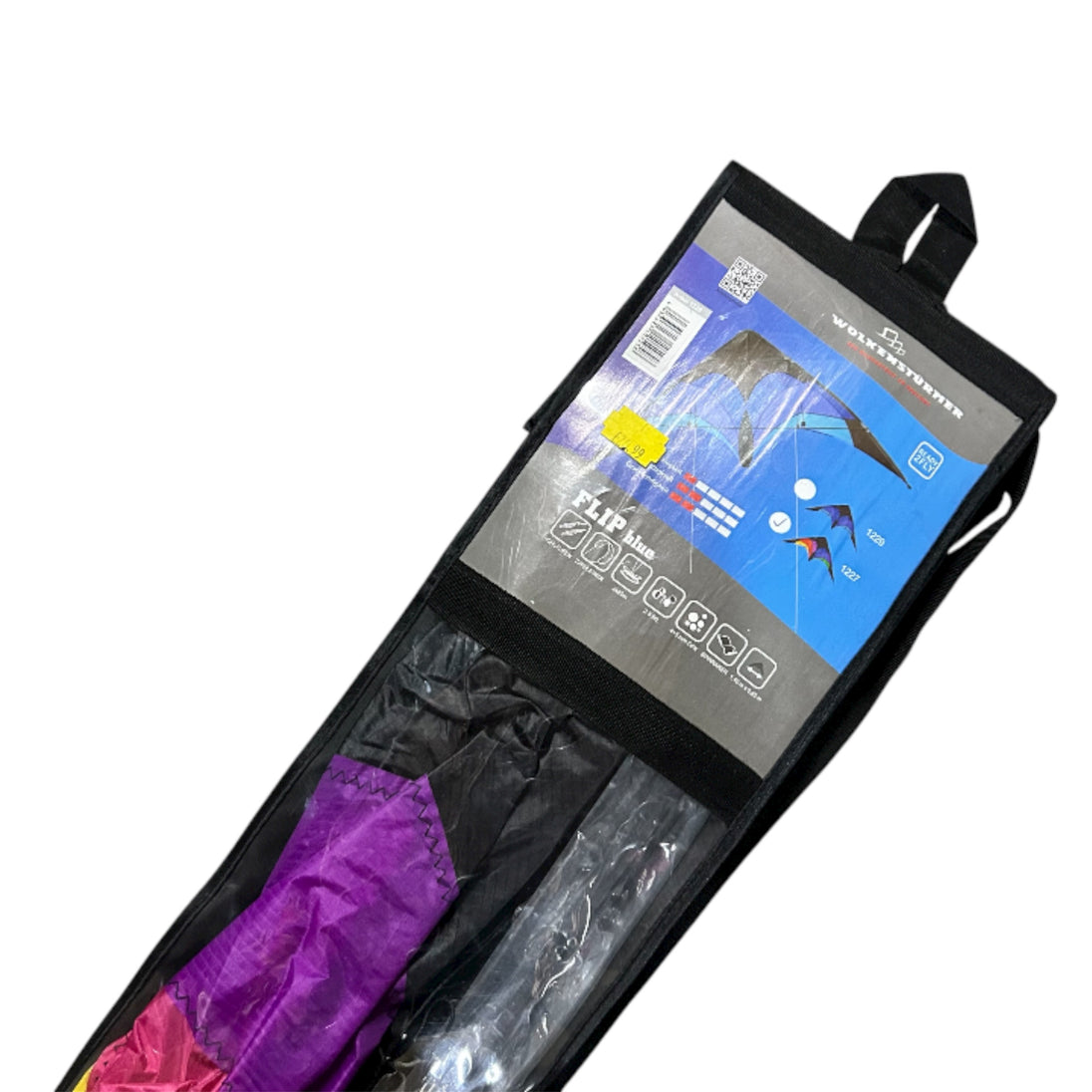 A perfect beginner's kite that provides a lot of flying fun. A wind force of 1.5-4 Bft is ideal for our flip. You will receive the kite with two 25 m polyester lines that are already attached and a winding board, a so-called winder, with which the flying lines are wound up again at the end of the kite flying. A pair of basic steering loops are also included in the delivery. These are coloured red and black, i.e. marked differently, so you can tell left and right better apart. With this ready-to-fly kite set, you don't need any additional accessories. Before the start, the kite needs to be set up for the flip and instructions will help you set it up quickly, and then it's time to take to the skies and have fun!